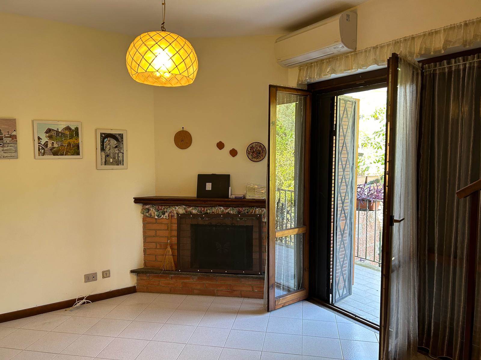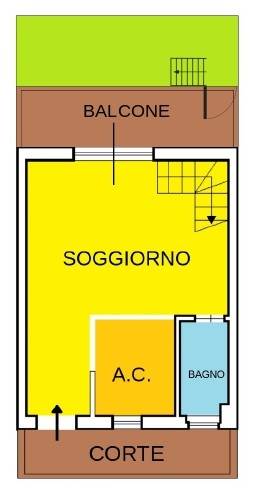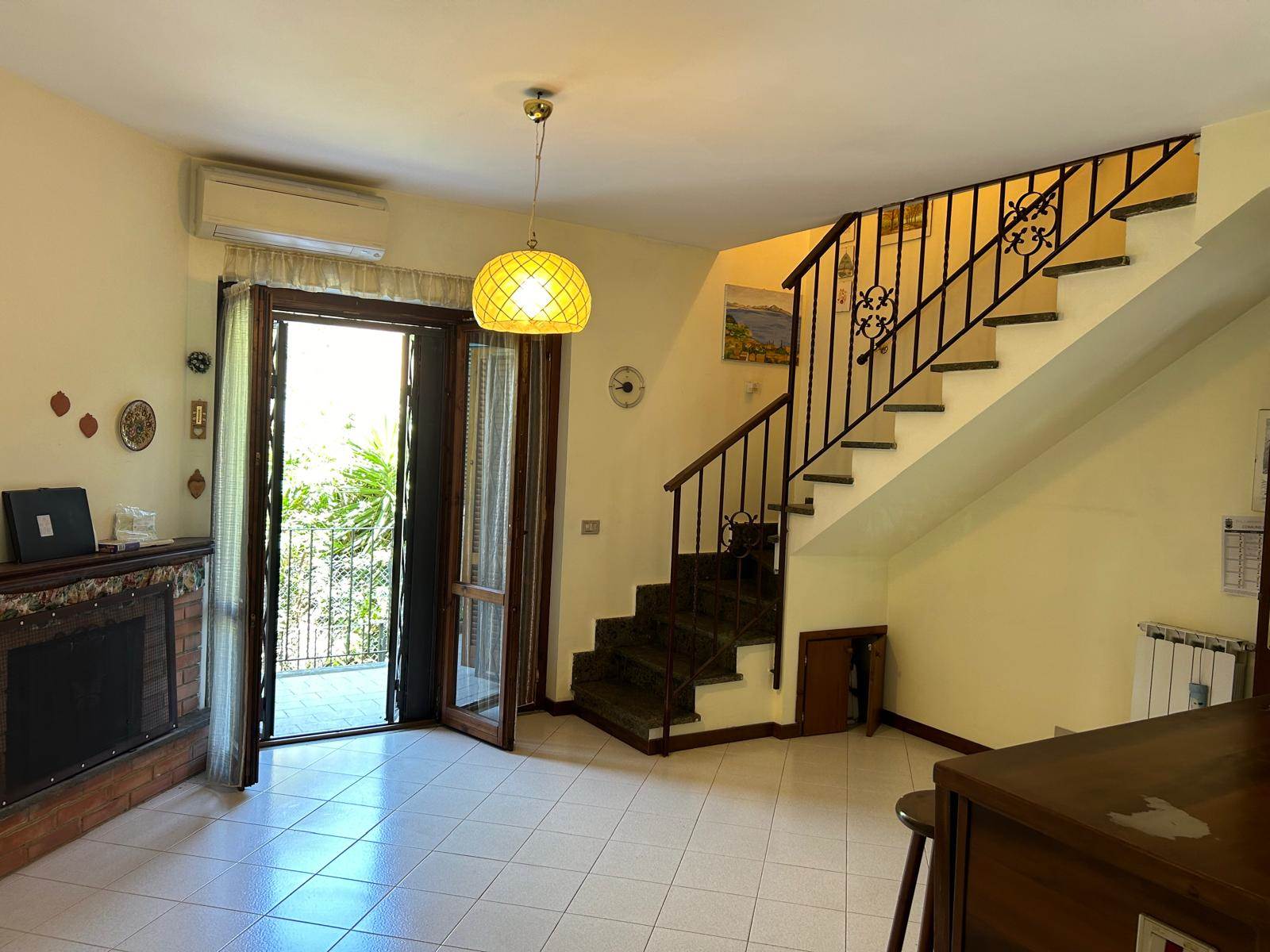 L’ingresso, attraverso una piccola corte privata, conduce alla zona giorno composta da soggiorno con angolo cottura e caratteristico camino, ideale per creare un’atmosfera calda e accogliente. Completa il livello un bagno di servizio e un balcone dal quale, tramite una piccola scala, si accede a un giardinetto privato.