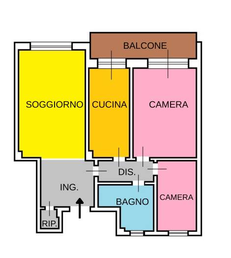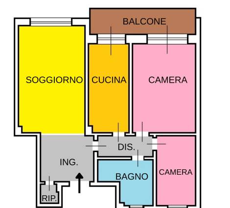 L’immobile è composto da ingresso, soggiorno, cucina abitabile, camera da letto, cameretta, bagno, ripostiglio e balcone.